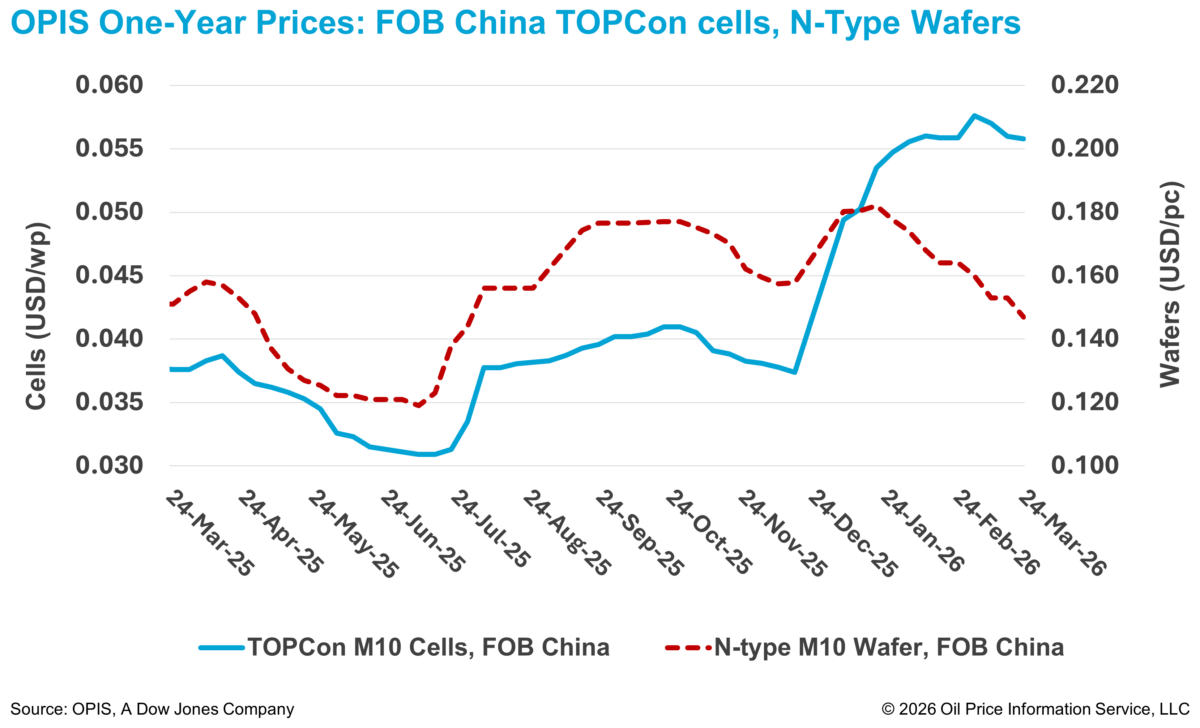 According to the OPIS Global Solar Markets Report released on March 24, Free-On-Board (FOB) China TOPCon M10 cell prices fell 0.36% this week to $0.0558/W, with weaker price guidance between $0.0535-0.0581/W. Meanwhile, FOB China prices for n-type M10 wafers fell 3.92% to $0.147/piece during the same period.