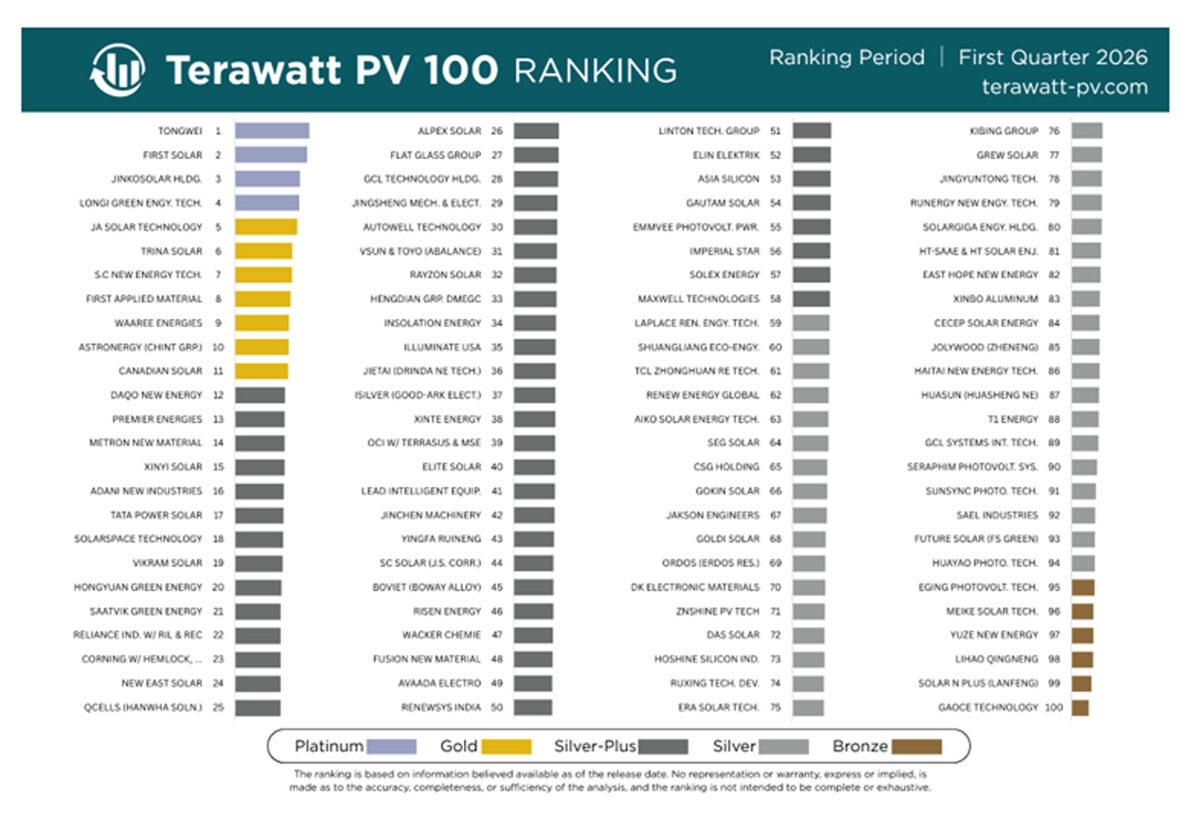 A new ranking and rating analysis for the solar photovoltaic (PV) manufacturing ecosystem is released today – the Terawatt PV 100. It reveals the top 100 PV manufacturers, ranked in order from 1 to 100, and rated in bands from Platinum through to Bronze.
