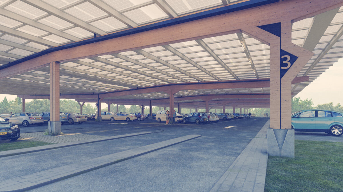 The solar carport in Apeldoorn, central Netherlands, will have more than 5,300 circular solar panels with an area of ​​two hectares. It will accommodate 925 vehicles under a supporting structure made of wood and recycled steel.