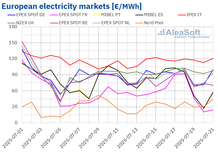 The last analysis of ALEASOFT finds the weekly average electricity price in most major European markets during the third week of July comparable to the week before. In the meantime, Spain broke his record for the daily production of solar energy on July 16.