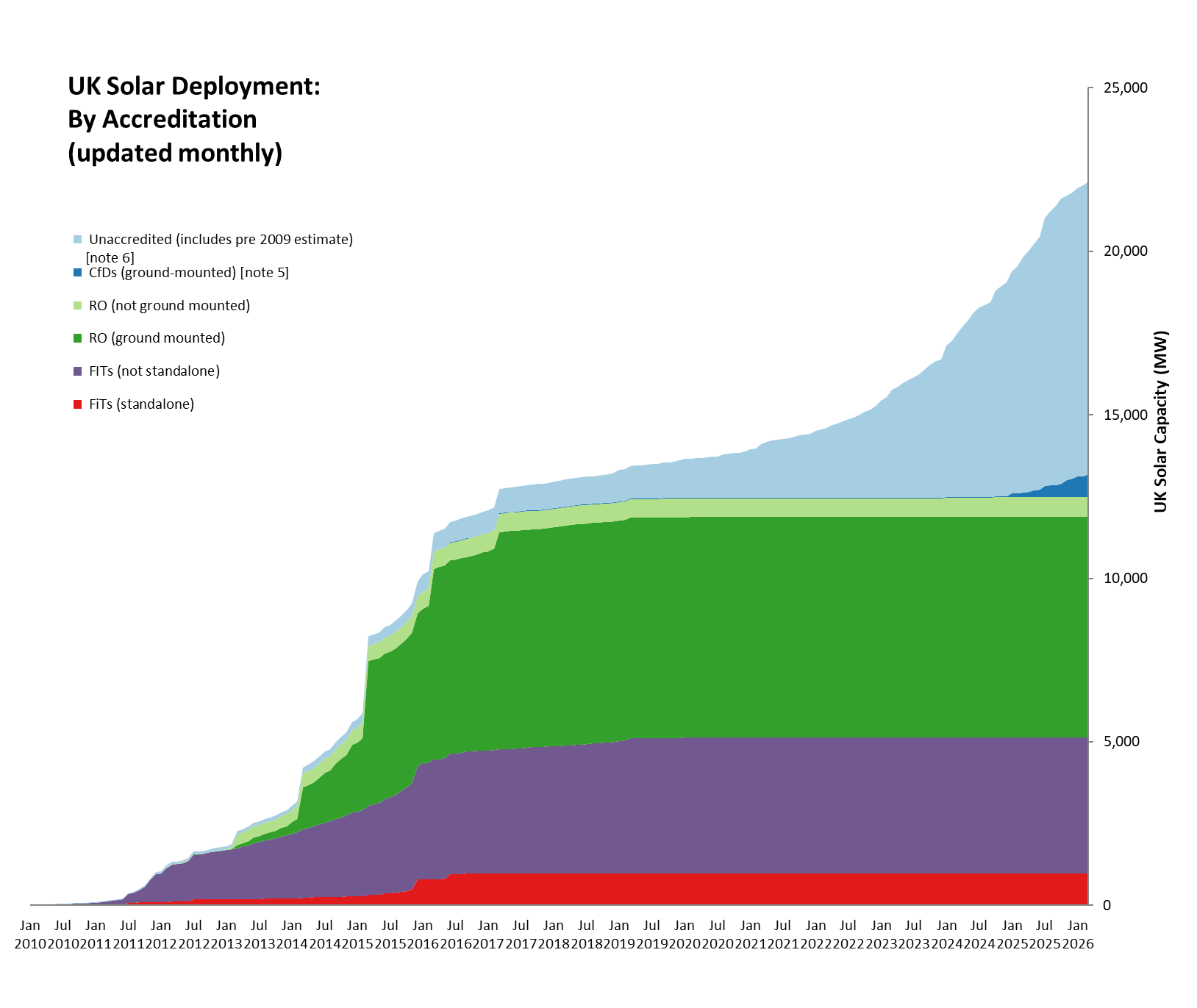 Government figures show that at the end of March 2026, at least 38% of capacity (8.4 GW) came from ground-mounted or standalone solar installations. This includes 25 operational solar power plants with CfDs, of which 19 came online in 2025 and four in 2026. The UK government’s database is based on its own research among major power producers (MPPs), the Renewable Energy Planning Database (REPD), the Microgeneration Certification Scheme (MCS) database and the databases subsidized by the Renewables Obligation (RO), Feed-in Tariff (FiT) and Contracts for Difference (CfD).
