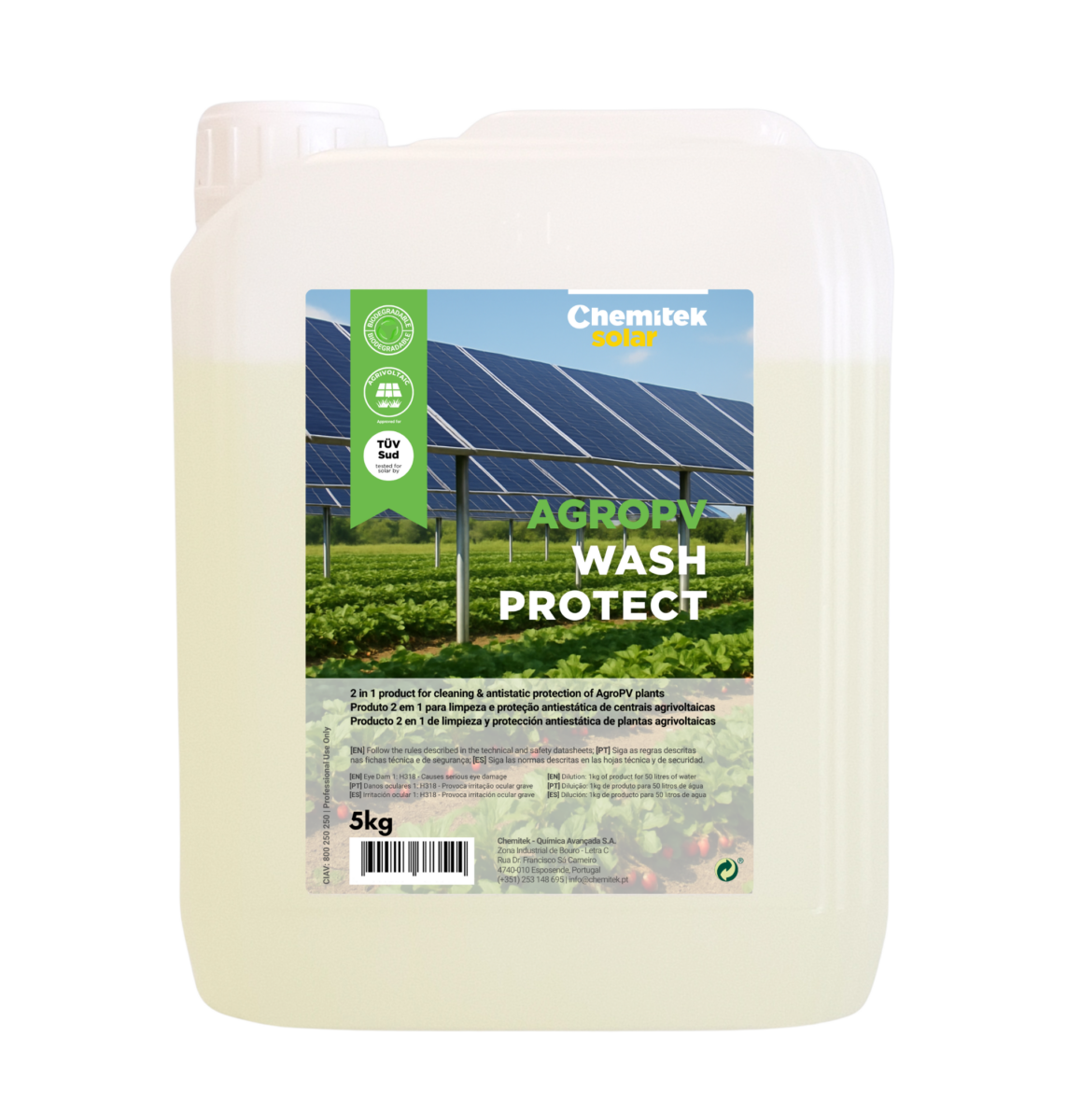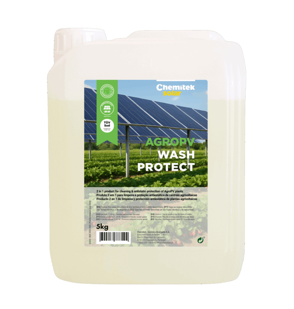 Agropv Wash Protect is a biodegradable solution that removes organic pollution from panels and protects it via an antistatic coating to rinse it again. The AgropV -Water softening agent is formulated to treat hard water in agricultural environments, to prevent mineral deposits according to Chemitek and to guarantee optimum panel performance.