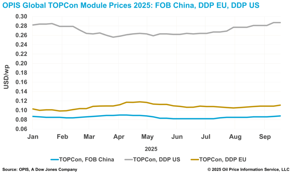 On the domestic market, Opis Topcon module prices rated on CNY 0.696 ($ 0.098)/W EXW China, unchanged compared to the previous week. The market remains stable as the participants wait for clearer policy signals for Q4 2025.