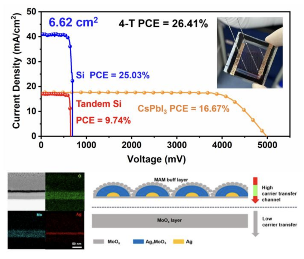 The MoOx/Ag/MoOx (MAM) buffer layer consists of a thin layer of silver (Ag) between molybdenum oxide (MoOx) layers that can act as the front cell window layer in semi-transparent CsPbI3 solar cells and 4T stacked cells.