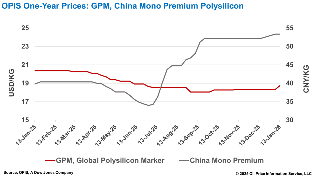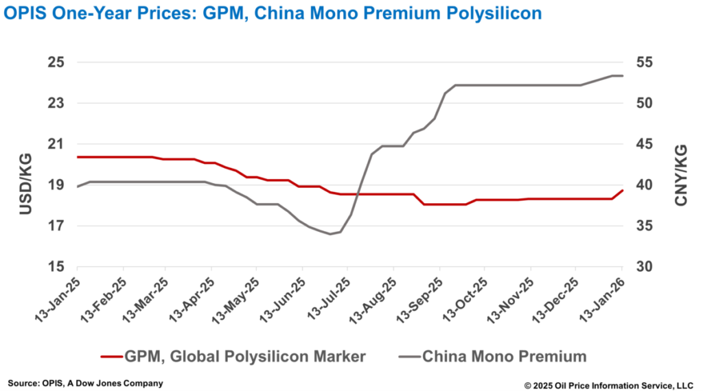 The Global Polysilicon Marker (GPM) – the OPIS benchmark for polysilicon produced outside China – was estimated at $18,728/kg, or $0.039/W, up 2.23% week-on-week, according to the OPIS Global Solar Markets Report published on January 13.