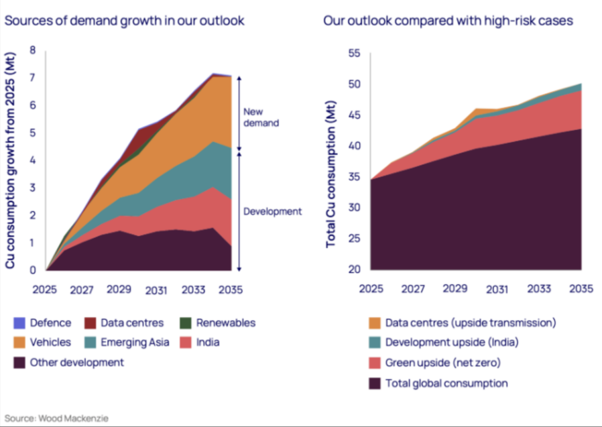Wood Mackenzie says the wider energy transition is “fundamentally reshaping copper consumption patterns”, with the shift to renewables expected to require an additional 2 Mtpa of copper supplies over the next decade.