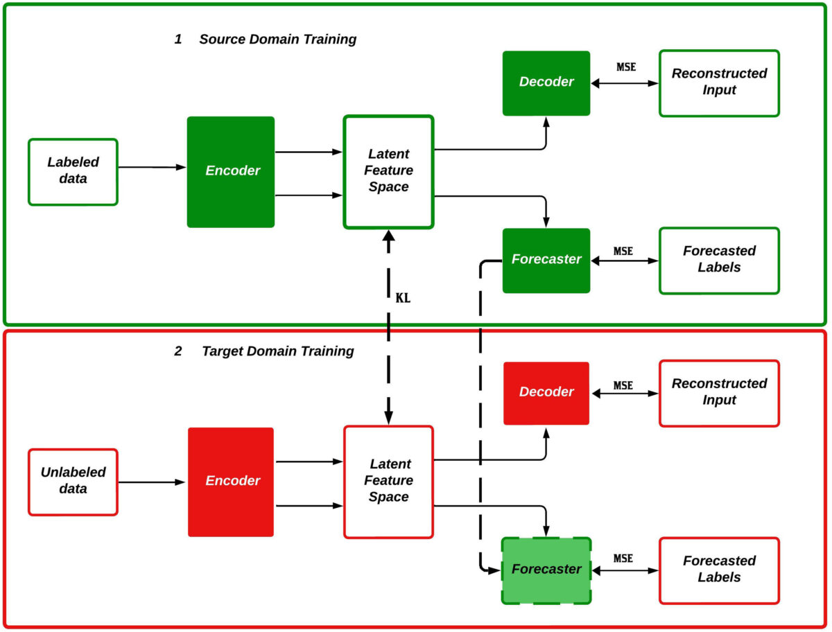 The model then adapts its power to a new PV factory, which has no data labels. It keeps the predictor for the source and only trains the encoder decoder by minimizing the divergence of Kullback-Libler (KL). KL Divergence is a statistical measure that represents the distance between two distributions.