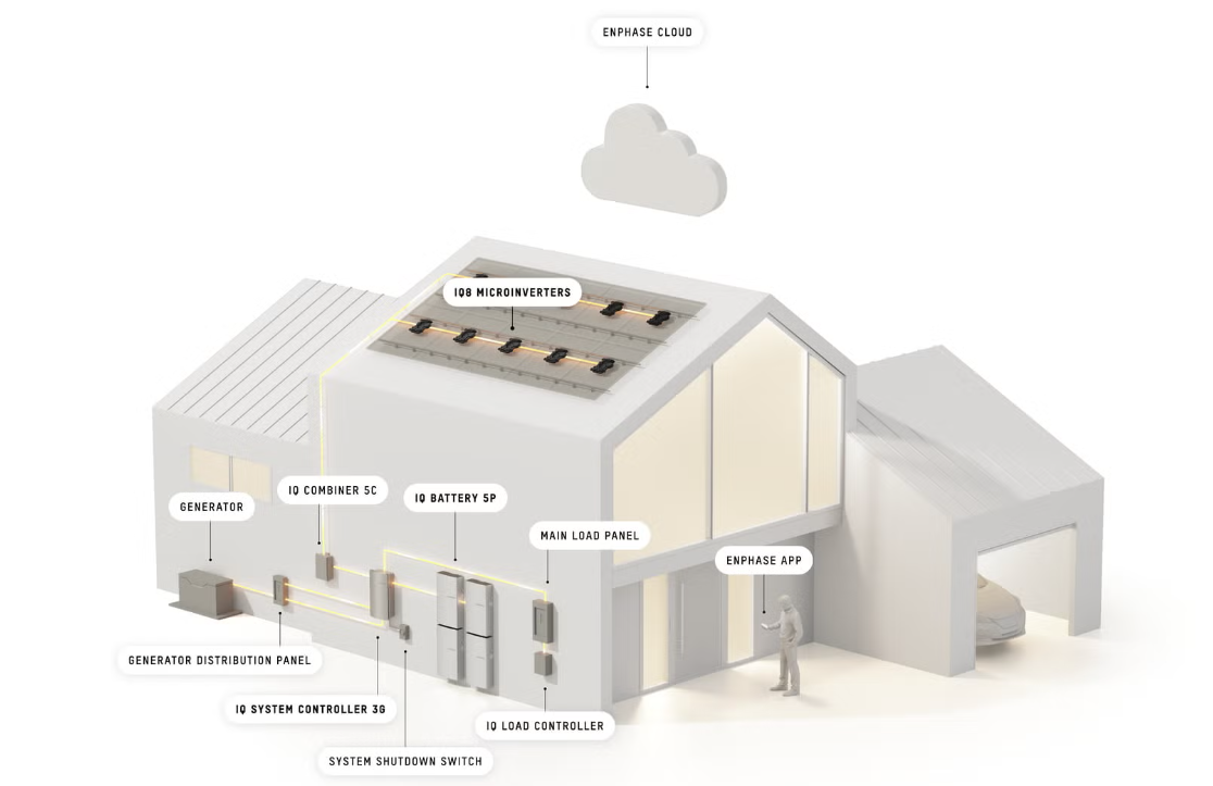 The system includes the IQ Battery 5P with built-in grid shaping microinverters, the IQ8 series microinverters with Sunlight JumpStart capability and a third-party standby AC generator. These components work together to power loads and charge batteries efficiently, with intelligent software that optimizes generator use when needed and prevents generator damage from back-feeding.