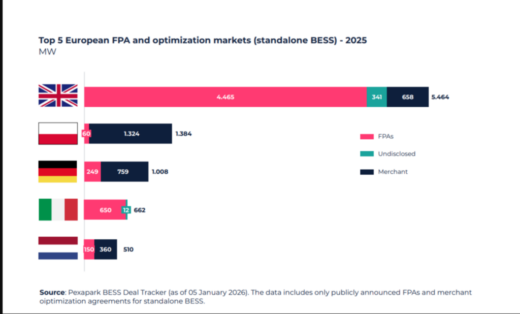 In a record year for flexibility in Europe, nearly 12 GW/24 GWh of BESS capacity was contracted under flexibility purchase agreements (FPAs) and optimization agreements, tripling the volume recorded in 2024, according to Pexapark’s Renewables Market Outlook 2026. FPAs have emerged as the backbone of BESS’s bankability, unlocking infrastructure-style capital and enabling rapid expansion outside Great Britain to Germany, Italy and the Netherlands is made possible.
