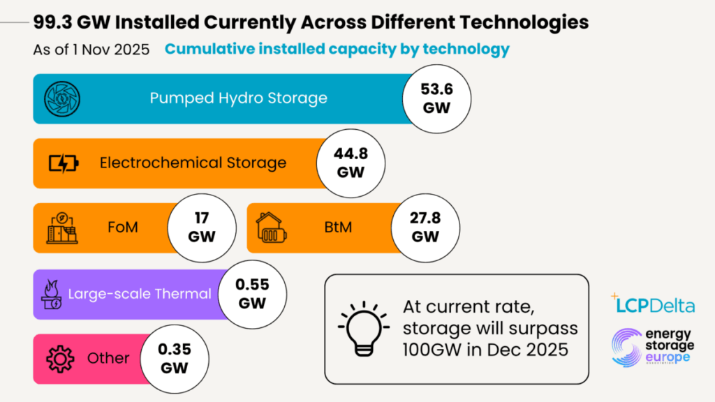 The European Union, the United Kingdom, Norway and Switzerland are expected to reach a combined 100 GW of installed energy storage later this month, according to a new analysis from LCP Delta and Energy Storage Europe.