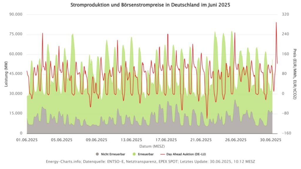 At 8 p.m. (CEST) on 30 June, the day-controlled electricity price was mentioned at just under € 0.289/kWh-the highest value for the month. Peak -daily prices in June often took place between 7 pm and 10 pm. The lowest price of the month was registered on June 22 at 1 p.m., at -€ 0.099/kWh.