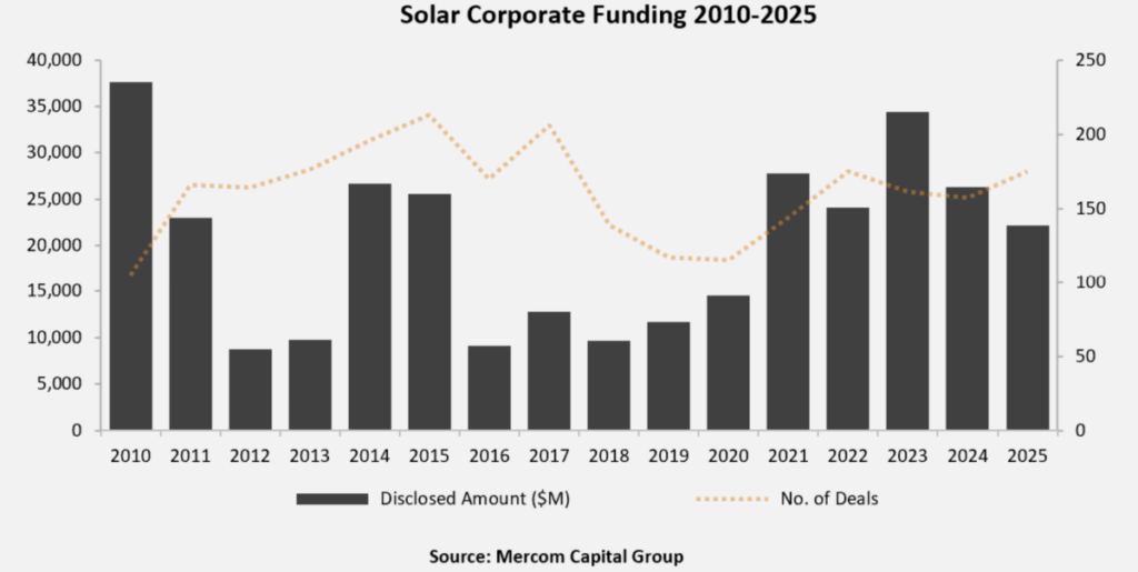Global corporate financing in the solar sector totaled $22.2 billion through 175 deals in 2025, according to data published by Mercom Capital Group in its Annual Report on Solar Financing and Mergers and Acquisitions 2025.