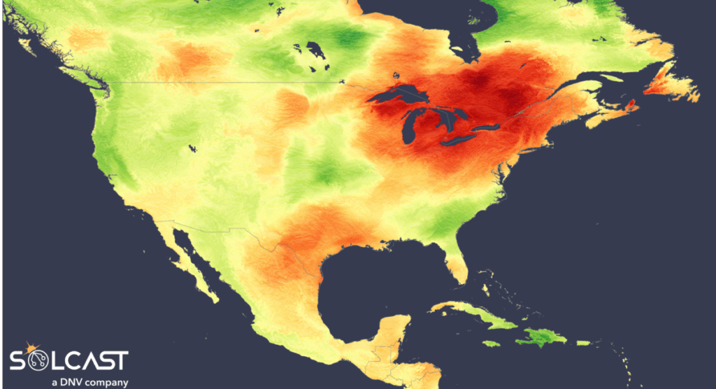 In a new weekly update for pv magazineSolcast, a DNV company, reports that North America experienced highly variable solar performance in October as a strong high-pressure system increased irradiance in the eastern regions, while cooler, cloudy conditions reduced solar potential in the Pacific Northwest.