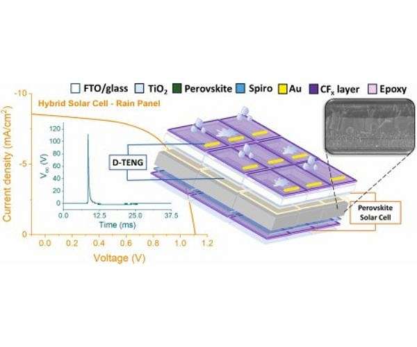 A team from the Institute of Materials Sciences of Seville, a joint center of the Spanish National Research Council and the University of Seville, has developed a hybrid energy harvesting device that can simultaneously generate electricity from both sunlight and rain. The concept is based on a thin multifunctional film that protects perovskite solar cells from harsh environmental conditions, while a triboelectric nanogenerator can capture the kinetic energy of raindrops as electrical output.