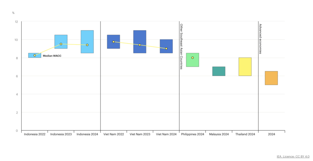 The latest update from the IEA Observatory on the cost of capital found that, based on survey responses, the median weighted average cost of capital (WACC) for solar in 2024 was 9.4% in Indonesia, 9% in Vietnam and 8% in the Philippines. The WACC is nominal, after taxes and adjusted to the local currency.