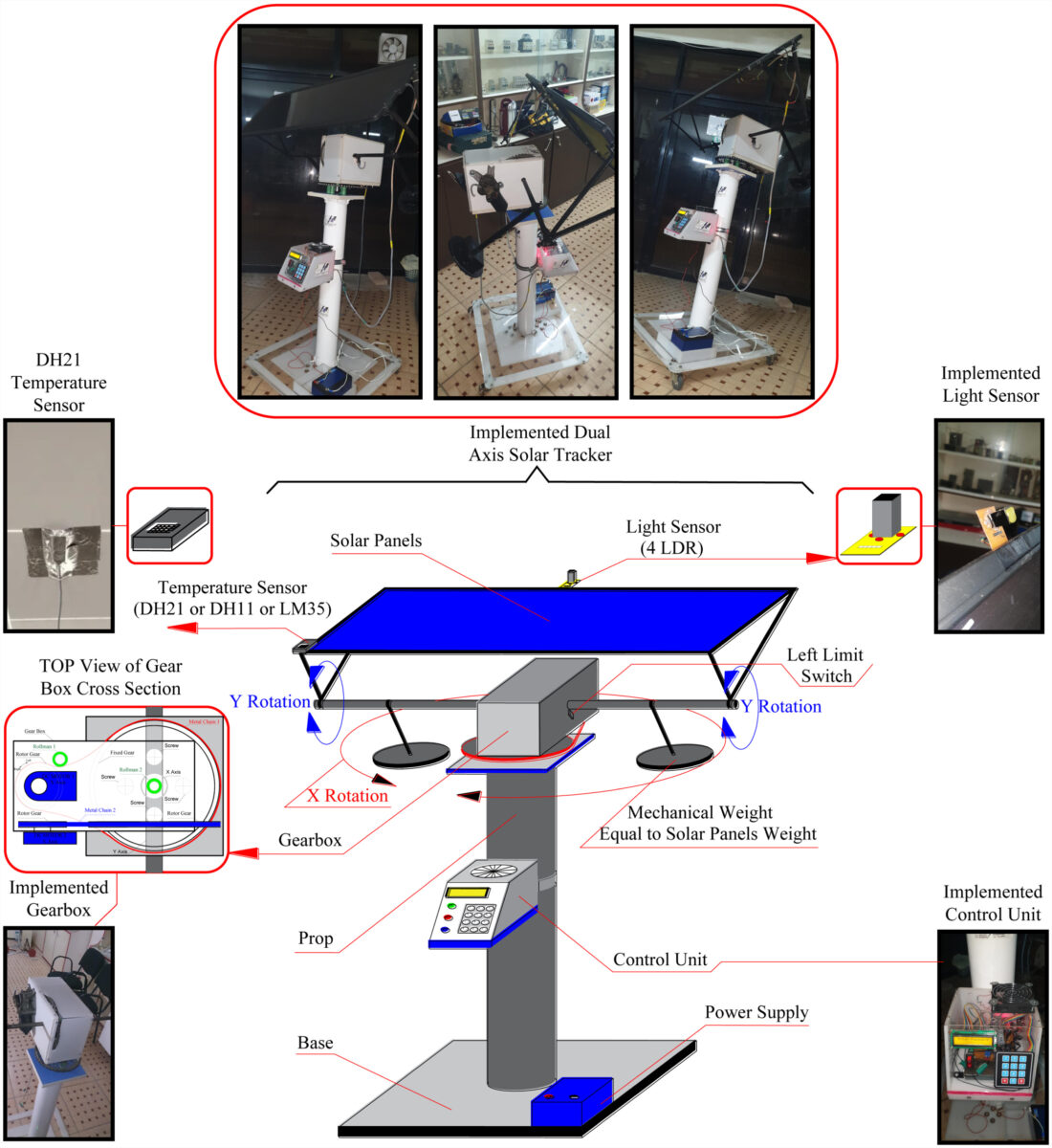 To optimize the system and before an experimental setup was made, the AutoCAD team used for design and proteus for simulation. In the case of the algorithm with the name Dasts-Hybrid standing combination, light sensors were used to detect sunlight, and then calculated mathematical comparisons where the sun should be and position the PV panel accordingly, using a microcontroller. The contra-weight used and DC engines that worked in continuous mode or semi-continuous mode.