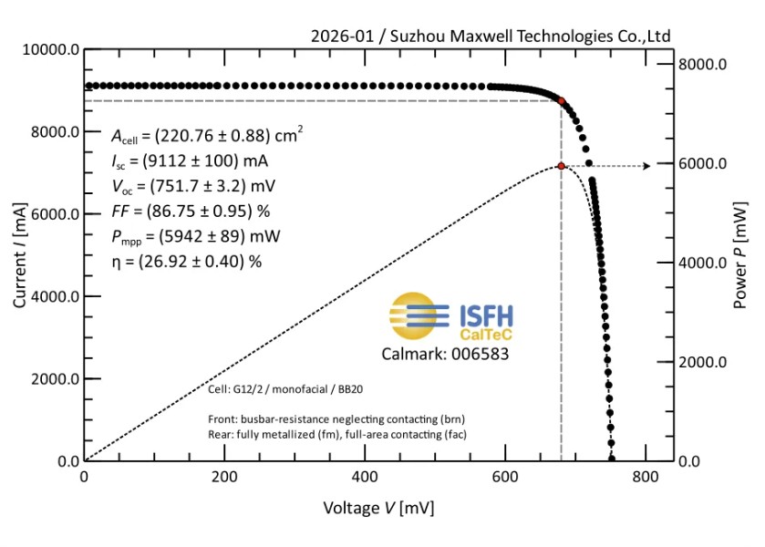 China-based PV equipment supplier Suzhou Maxwell Technologies Co., Ltd. has announced that it has achieved an energy conversion efficiency of 26.92% for a heterojunction (HJT) solar cell.