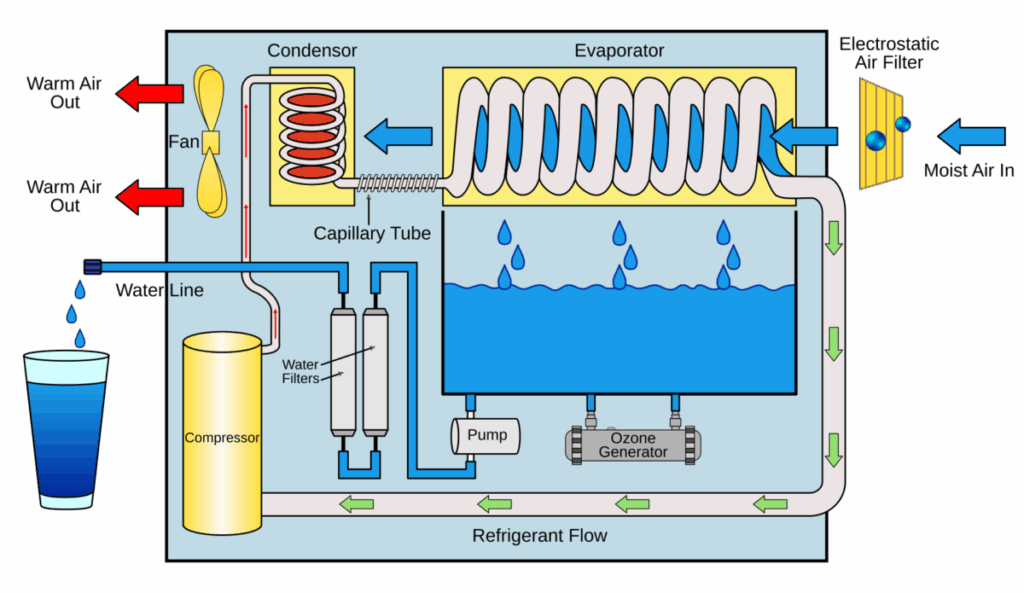 AWH Systems extracting water vapor from the air and condense it in liquid water, using desplans, heat exchangers and vapor compression -cooling (video recorder).