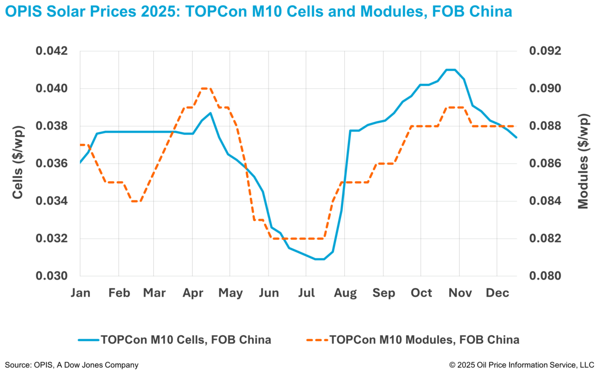 According to the OPIS Solar Weekly Report published on December 16, FOB China TOPCon M10 cell prices were assessed 1.06% lower at $0.0374/W, with price guidance between $0.0364-0.0387/W.
