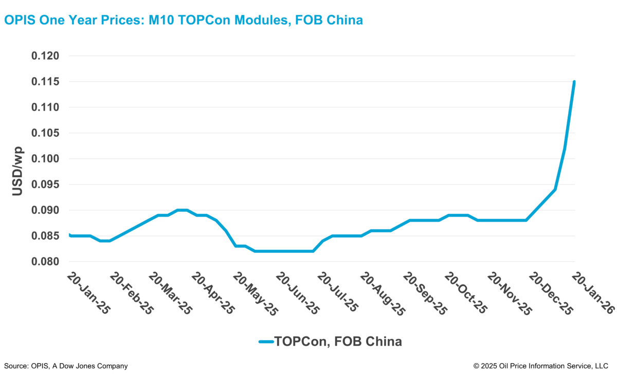 According to the OPIS Global Solar Markets Report released on January 20, the Chinese Module Marker (CMM), the OPIS benchmark rating for TOPCon modules from China, rose 12.75% this week to $0.115/W Free-On-Board (FOB) China.