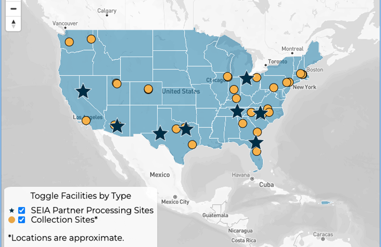 - An interactive map showing collection locations for recyclable equipment and the locations of SEIA’s vetted PV recycling partners