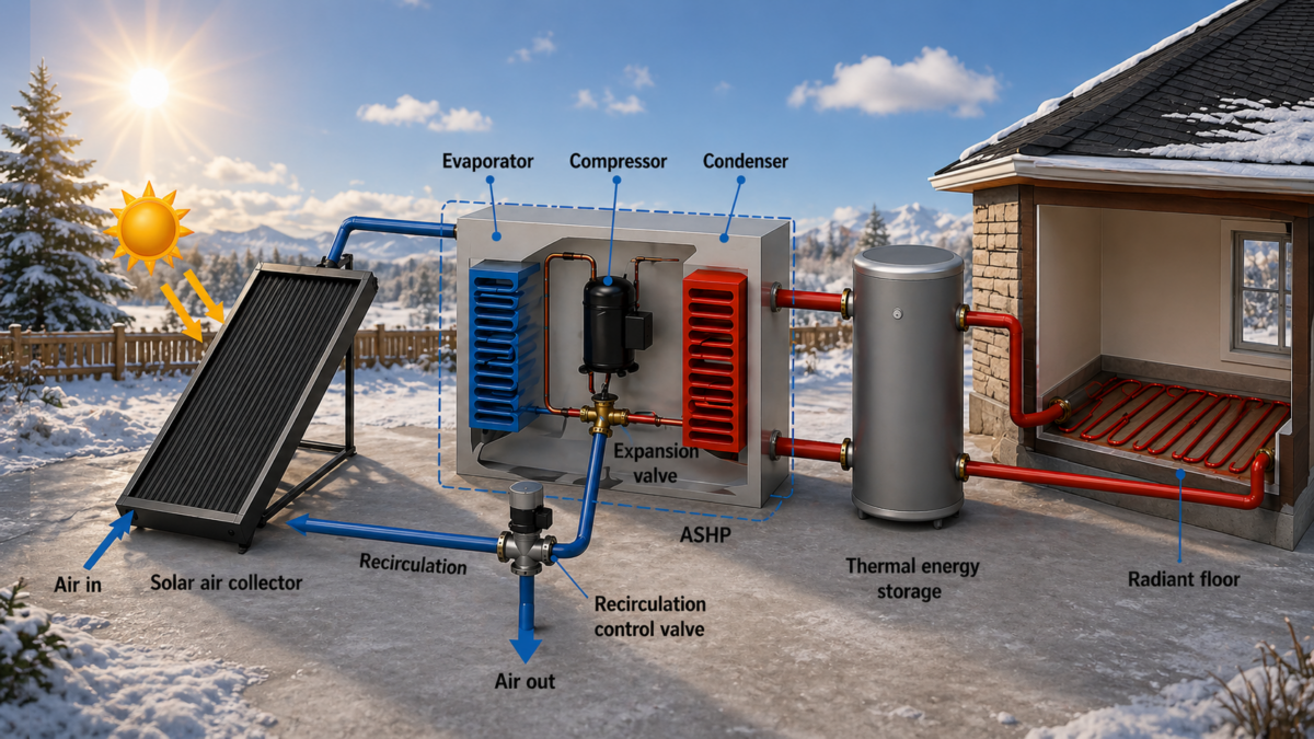 Researchers in Canada designed an air source heat pump integrated with an air-based solar collector and underfloor heating for cold climates, demonstrating that the proposed system configuration could improve the coefficient of performance from 2–4 to 2–6 and significantly reduce annual energy consumption.