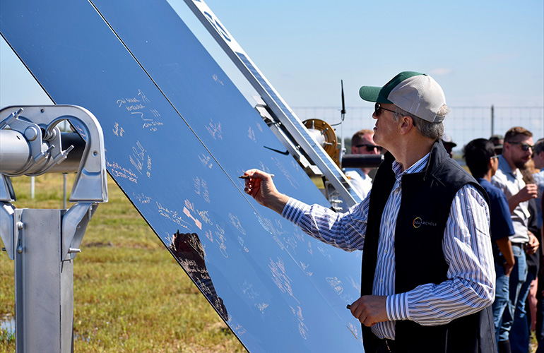 CEO of Nexpracker, Dan Shugar, draws a Nexpracker Tracker -display at the ribbon cut of the Eldorado Solar Project in Saline County, Illinois.