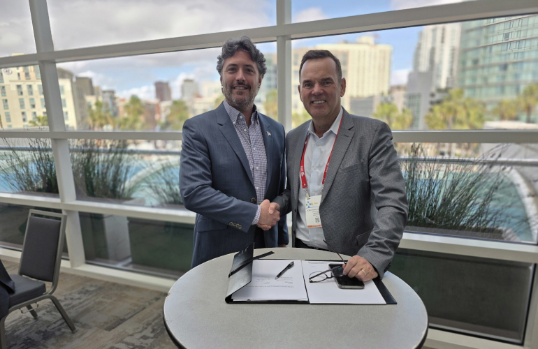 Talon PV CEO Adam Tesanovich and NexWafe VP Business Development USA Jonathan Pickering sign the wafer supply agreement at Intersolar North America.