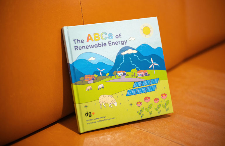 The project features original illustrations by Mary Duncan-Sain, a former DG+ senior visual designer. Her vibrant images bring solar panels, wind turbines and electric vehicles to life with charm and creativity. The text was written by Mel Phillips, a former DG+ team member. Kathleen Gill, another former team member, also contributed to the book.