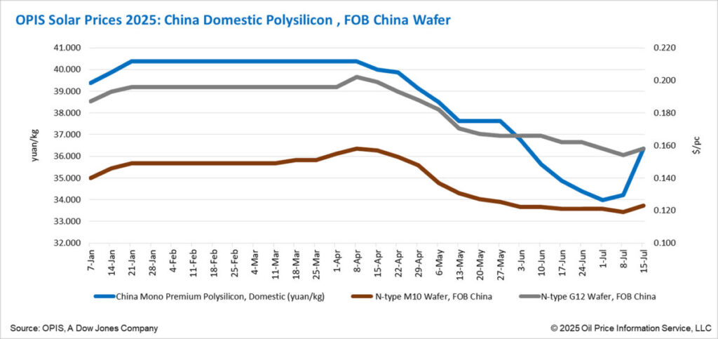 According to the Opis Solar Weekly Report released on July 15, the China Mono Premium-OPISs benchmark price rating for mono-grade polysilicon that is specifically used in N-type Ingot production for the inland Chinese market for the inland Chinese market-with 6.21% week-on week, with a CNY 36.350 0.076/w.