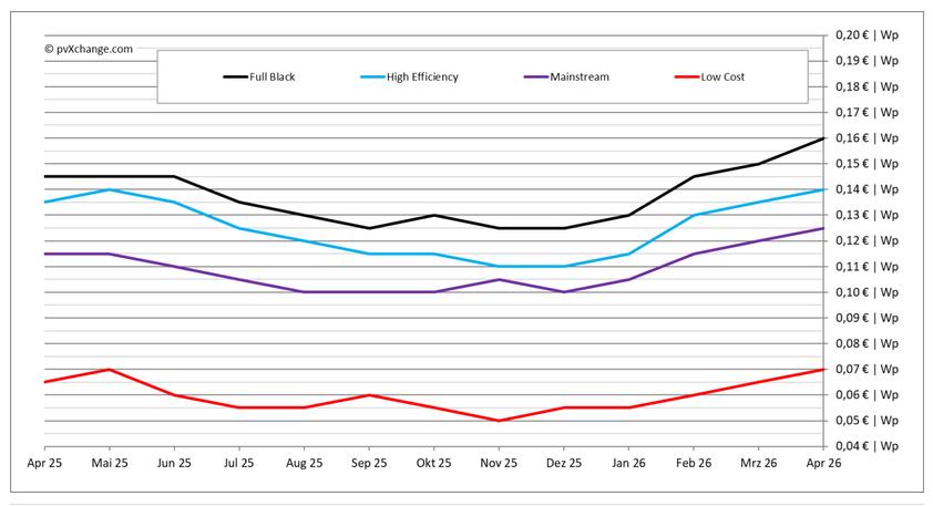 For the fourth month in a row, prices for photovoltaic modules have increased across all technologies. Although the pace of increase has slowed compared to the beginning of the year, the upward trend remains intact. Between March and April, average prices rose by 5.5%, with all-black modules recording the strongest increases.