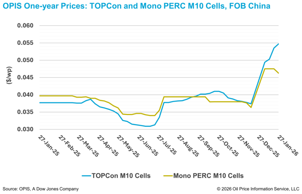 According to the OPIS Global Solar Markets Report published on January 20, Chinese TOPCon M10 cell prices were assessed 2.24% higher this week at $0.0547/W Free-On-Board (FOB) China. Meanwhile, FOB China Mono PERC M10 cells fell 2.53% to $0.0463/W over the same period.