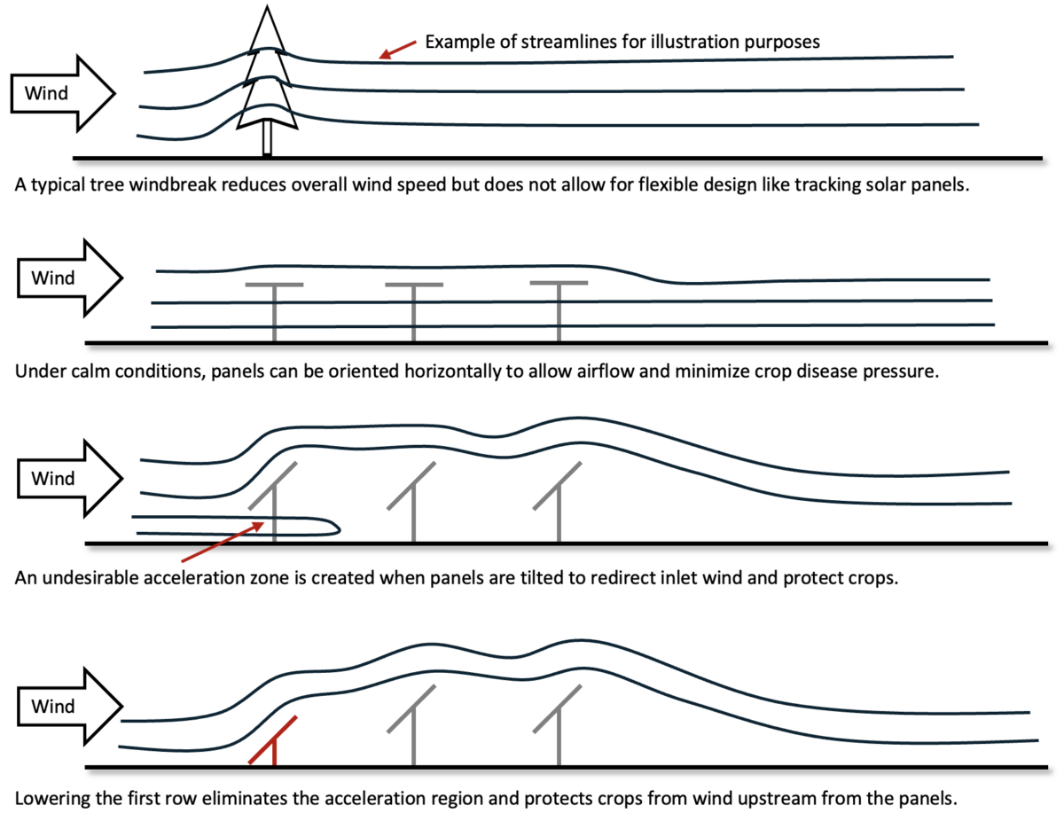 Researchers at Cornell University have shown that tracking solar panels in agrivoltaic systems can protect crops from wind damage while allowing airflow, outperforming traditional single-row windbreaks. They also proposed a new lowered front row panel design that improves wind protection, achieving up to 86% lower wind speeds in the sheltered zones under extreme conditions.
